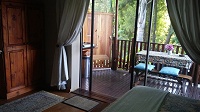 This room leads onto a wooden balcony overlooking the mountains, garden and swimming pool.